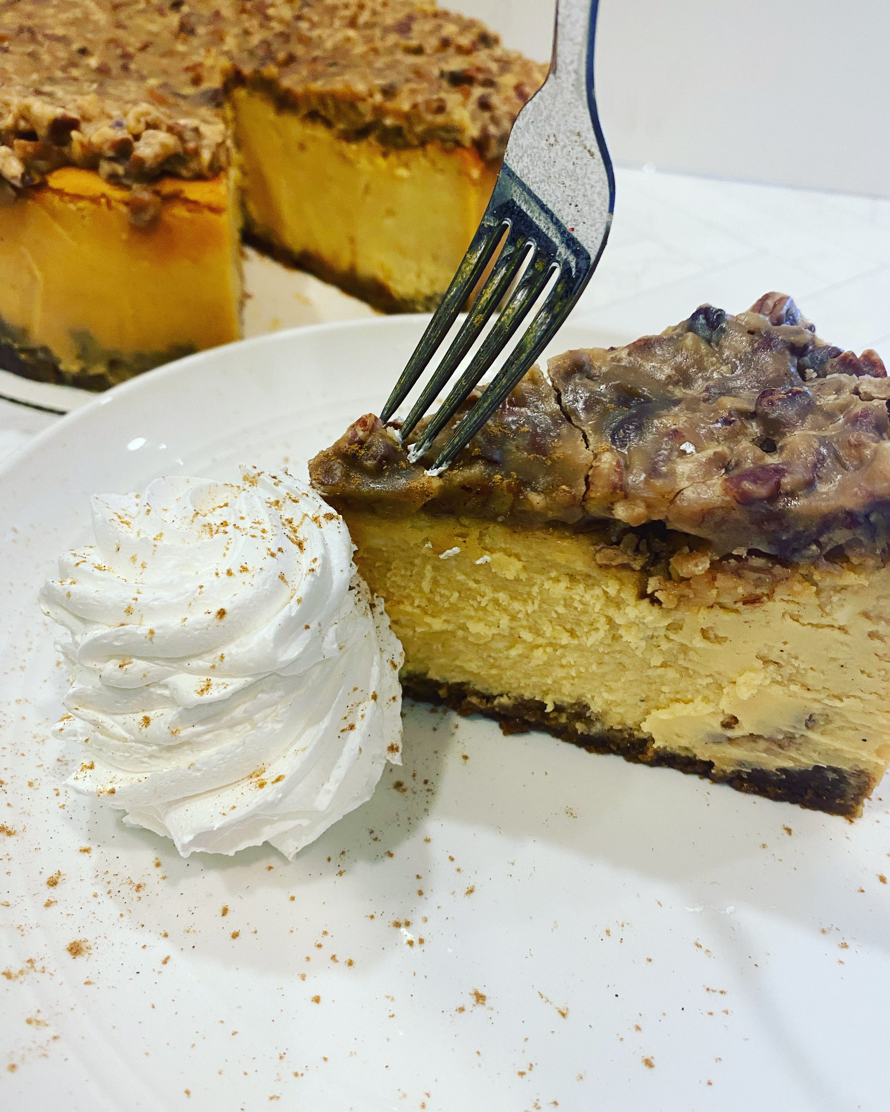 Our Pecan Pie Cheesecake literally had a whole pecan pie right on the middle. And our Brooke gives you brownie + chocolate chip cookie + cheesecake = deliciousness!!!